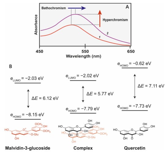 (A) Co-pigmentation of malvidin 3-glucoside with quercitin at pH 3.6. 1 = 500 μM malvidin 3-glucoside, 2 = 500 μM malvidin 3-glucoside + 1 mM quercitin [22]. (B) The molecular orbital correlation diagram of malvidin 3-O-glucoside and quercetin shows the energy changes as a result of co-pigmentation complex formation. Reduction of highest occupied molecular orbital of chromophores (HOMO)–lowest unoccupied molecular orbital (LUMO) energy gap (ΔE) results in a bathochromatic shift [23].
