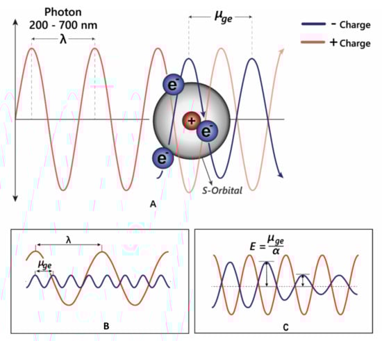 The third effect of co-pigmentation is the bathochromic shift (Figure 5B), caused by distortions in the electron orbitals between closely interacting aromatics [24]. Light is an electromagnetic wave, with an alternating dipole which is proportional to its wavelength. Relative to the strength of the electromagnetic field, atomic nuclei are too dense to experience any substantial polarisation, but electrons which are comparatively small experience a polarising effect when exposed to electromagnetic fields. As electrons carry a negative charge and oscillate in electromagnetic fields (harmonic oscillation, Figure 5), they induce dynamic polarisation in the molecular orbital. Electrons that oscillate at the same frequency as an incident photon (termed degenerate) can absorb energy from those photons, promoting them to a higher energy state (from HOMO–LUMO). This additional energy is radiated to the surroundings within picoseconds through a number of mechanisms as the electron moves back into the ground state [15].
