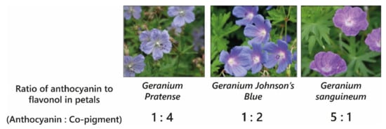 Blue colouration by intermolecular co-pigmentation alone is not common, and when it occurs, it is usually the result of co-pigmentation of anthocyanins with glycosylated flavonols and flavones. The blue-purple-coloured flowers of cranesbill, Geranium “Johnson’s Blue”, Geranium pratense, and Geranium sanguineum all contain the same anthocyanins: malvidin 3-O-glucoside-5-O-(6-O-acetylglucoside) and a minor fraction of malvidin 3-O-(6-O-acetyl glucoside) [30]. The variation in colour between these varieties (Figure 7) results from differences in the molar concentrations of flavonol co-pigments kaempferol and myricetin 3-O-glucoside and 3-O-sophoroside, with the blue-coloured petals of Geranium ‘Johnson’s Blue’ and G. pratense containing significantly higher molar ratios of flavonols than G. sanguineum [30,31] (Figure 7).