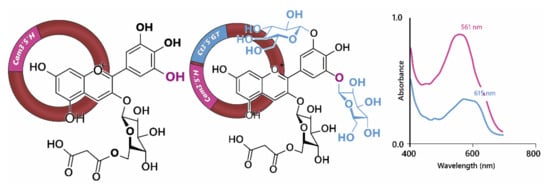 - Kallam, K.; Appelhagen, I.; Luo, J.; Albert, N.; Zhang, H.; Deroles, S.; Hill, L.; Findlay, K.; Andersen, Ø.M.; Davies, K.; et al. Aromatic Decoration Determines the Formation of Anthocyanic Vacuolar Inclusions. Curr. Biol. 2017, 27, 945–957. [Google Scholar] [CrossRef]
