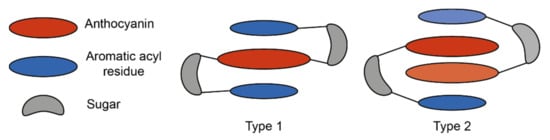 Anthocyanins which are acylated with aromatic hydroxycinnamic (HCA) derivatives form non-covalent intramolecular associations with their covalently linked HCA moieties, which fold over the chromophore, protecting the chromophore from hydration [37] (Figure 9).