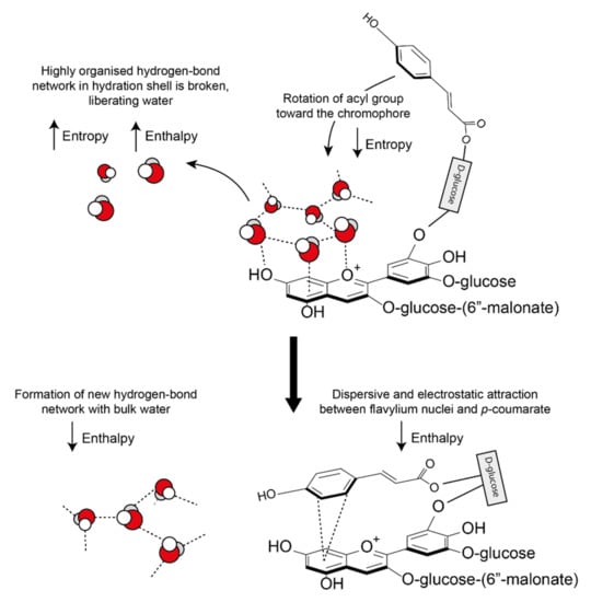 These hydrophobic interactions are both classical (entropic) and nonclassical (enthalpic). Water molecules solvating anthocyanins and their co-pigments form a highly organised hydrogen bond network around the aromatic intramolecular region (hydrophobic cavity) [25]. As the pigment and co-pigment come together, the hydrogen bonds between water molecules in the solvation shell are broken and released from the hydrophobic cavity, increasing the system entropy and enthalpy (Figure 16). The barrier to complex formation is further reinforced by the required decrease in the system entropy (requiring energy) as the acyl group rotates about the C6” axis to form a highly ordered structure.