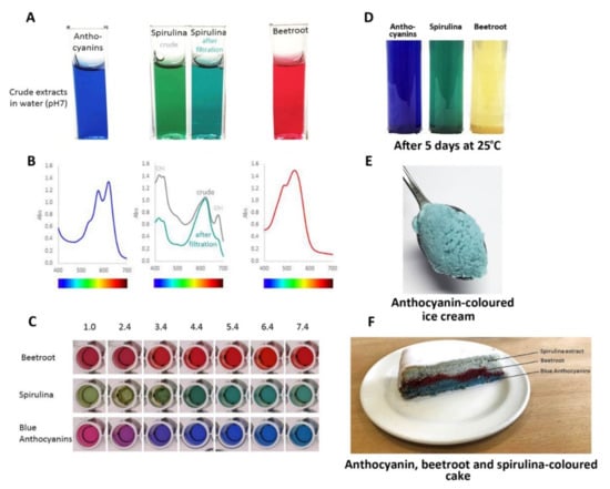 Comparison of performance of natural colours from different botanical sources: blue from flowers of butterfly pea, commercial natural “blue” from spirulina, and red from beetroot. (A) The colours of these colourants following fresh extraction/preparation in water at pH 7.0. The spirulina extract changed colour slightly following filtration to remove non-water-soluble material. (B) The visible absorption spectra of these colourants. Filtering of the spirulina extract removed some of the material absorbing at shorter wavelengths. (C) The effect of pH on the three colourants. The blue anthocyanins from butterfly pea did not maintain their “blueness” below pH 3.0, but provided strong blues over the range pH 3.0–8.0. (D) Stability of colours following the storage of fresh extracts at room temperature for 5 days. The red colour conferred by the betacyanins of beetroot showed poor stability. (E) Blue ice cream coloured by an extract from flowers of butterfly pea. (F) The effects of cooking on colour stability. The colour of the spirulina extract was particularly sensitive to high temperature.