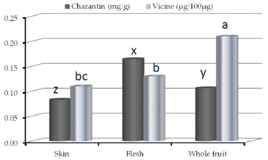 Charantin and vicine contents in skin, flesh and whole fruit of bitter melon. x,y,z indicated significant differences in charantin contents (p < 0.05); a,b,c indicated significant differences in vicine contents (p < 0.05).