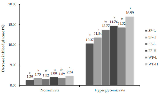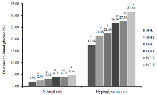 Percent decrease in glucose level after feeding bitter gourd on 28th day. Bars that do not share similar letters denote statistical significance (p < 0.05).