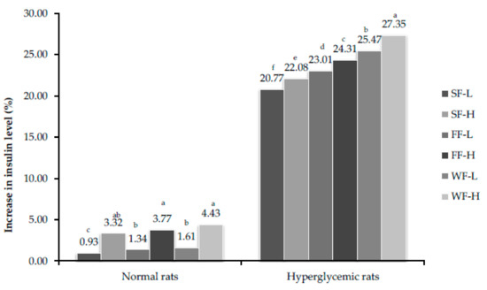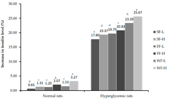 Percent increase in insulin level after feeding bitter gourd on 56th day. Bars that do not share similar letters denote statistical significance (p < 0.05).