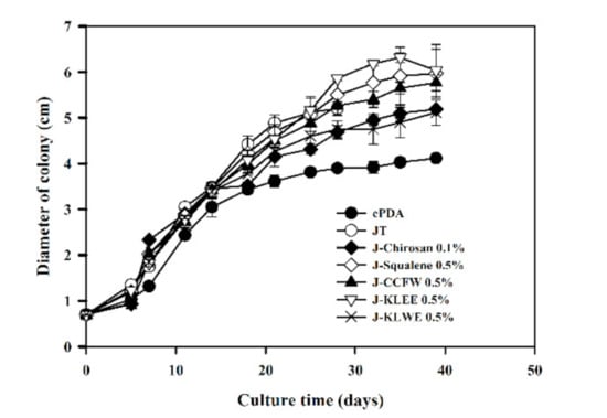 After culturing for 29 days, the growth of mycelia began to slow down (Figure 1), and the color of the mycelia changed from red to orange (Figure A1). The mycelia cultured in all Job’s tears agar (JTA) media (i.e., JTA-squalene, JTA-chitosan, JTA-KLEE, JTA-KLWE, JTA-KFW, and JTA-chitosan) exhibited a similar color-change phenomenon after 32 days. Therefore, the mycelia were harvested at day 32. The mycelia grew best on JTA-KLEE (6.18 ± 0.06 cm) (Figure 1). This finding indicates that the additional ethanol extract of the C. kanehirai leaf promoted the growth of mycelia of A. cinnamomea.