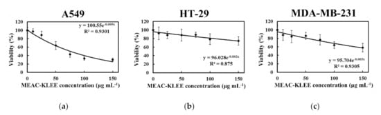 To explore the effect of MEAC-KLEE on cancer cells, A549 (human non-small-cell lung cancer) cells, HT-29 (human colon cancer) cells, and MDA-MB-231 (breast cancer) cells were incubated with MEAC-KLEE, respectively. The WST-1 assay indicated that treatment with MEAC-KLEE (150 μg mL−1) inhibited the viability of A549, HT-29, and MDA-MB-231 cells by 70%, 26%, and 42%, respectively (Figure 3). MEAC-KLEE (150 μg mL−1) significantly reduced the A549 cell viability, with an IC50 value of 77.6 μg mL−1 (Figure 3a). However, MEAC-KLEE exhibited lower cytotoxicity against HT-29 and MDA-MB-231 (IC50 > 150 μg mL−1 for both). Thus, the potential anti-proliferative activities MEAC-KLEE’s are more specific to A549 cells than the other two cancer cells.