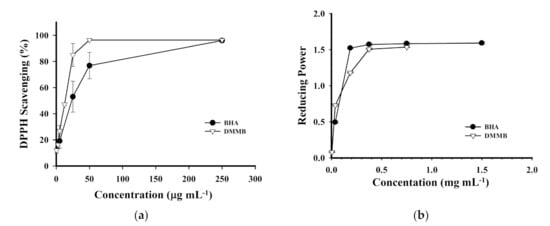 Antioxidant activity assays of DMMB. (a) DPPH free radical-scavenging effects. (b) Reducing power. Each value is expressed as the mean ± SD (n = 3).