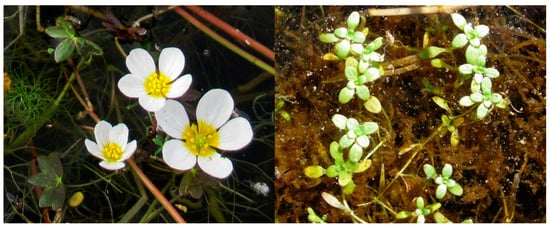 - Wiegleb, G.; Bobrov, A.A.; Zalewska-Gałosz, J. A taxonomic account of Ranunculus section Batrachium (Ranunculaceae). Phytotaxa 2017, 319, 1–55. [Google Scholar] [CrossRef]