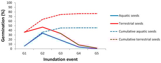 Considering the total number of seeds in the experiment, cumulative percent germination differed significantly between morphotypes (F1, 280 = 46.66, p < 0.0005) and among inundation events (F4, 280 = 14.55, p < 0.0005), but the interaction between the variables was not significant. Pairwise comparison revealed that the percent germination for the aquatic and terrestrial seeds differed exclusively during G1 (Tukey test, p = 0.017), and the difference between the cumulative percent germination of both groups persisted in the subsequent inundation events (Figure 3). The percent germination for the aquatic seeds in G1 differed from the cumulative percent germination for the aquatic seeds during all the other inundation events (p < 0.05 for the four paired comparisons). The same was true for the terrestrial seeds (p < 0.005), except that the difference in the percent germination between G1 and G2 was marginally insignificant (p = 0.07).