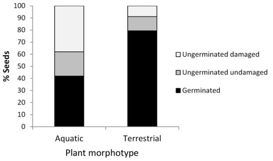 Percentage of germinated and ungerminated Callitriche brutia seeds at the end of the inundation experiment (aquatic morphotype seeds = 587, terrestrial morphotype seeds = 214). The ungerminated seeds were visually assessed and classified as undamaged or damaged.