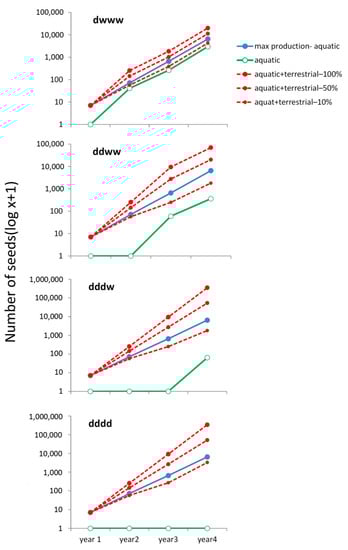Results of the Ranunculus peltatus subsp. saniculifolius seed production simulations. The starting number of seeds was 100. Seed production patterns were then modeled across four years with different sets of climatic conditions (dwww: one dry year followed by three wet years; ddww: two dry years followed by two wet years; dddw: three dry years followed by a wet year; dddd: four dry years). Annual seed production was estimated using the percent germination values from the experiment. Percent germination values for aquatic morphotype plants were applied in wet years (G1 = 0.0606, G2 = 0.3397, G3 = 0.1892, and G4 = 0.04), and percent germination values for terrestrial morphotype plants were applied in dry years (G1 = 0.3605, G2 = 0.4711, G3 = 0.3332, and G4 = 0.0850). It was assumed that the survival of the aquatic morphotype plants was 100%. The simulations also examined the effect of reducing the area available for terrestrial morphotype growth by setting the relative size of the terrestrial morphotype population (i.e., the number of terrestrial morphotype plants relative to the number of aquatic morphotype plants that grow in a wet year) to 100%, 50%, or 10%. For the sake of comparison, maximum seed production by aquatic morphotype plants across four wet years (blue line) has been included in each figure.