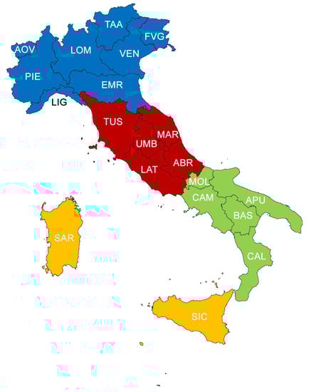 Division of Italy into sectors (North—blue, Centre—red, South—green, major islands—orange). Abbreviations of the administrative regions: AOV = Aosta Valley, PIE = Piedmont, LOM = Lombardy, TAA = Trentino-Alto Adige, VEN = Veneto, FVG = Friuli-Venezia Giulia, LIG = Liguria, EMR = Emilia Romagna, TUS = Tuscany, UMB = Umbria, MAR = Marche, ABR = Abruzzi, LAT = Latium, CAM = Campania, MOL = Molise, APU = Apulia, BAS = Basilicata, CAL = Calabria, SIC = Sicily, SAR = Sardinia.