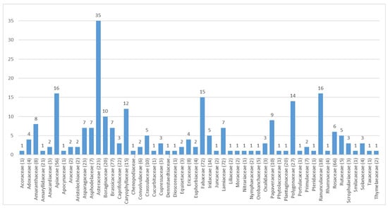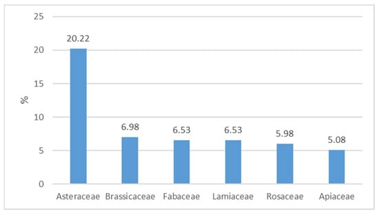 Of the 108 families included, the most widespread appeared to be Asteraceae with 20.22% of taxa, followed by Brassicaceae (6.98%), Fabaceae and Lamiaceae (6.53%), Rosaceae (5.98%), and Apiaceae (5.08%) (Figure 2). These six families account for 51.31% of the total taxa in the database. The prevalence of Asteraceae further confirms the records in numerous publications on the subject of phyto-alimurgy [].