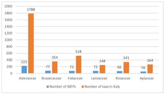 The number of WEPs recorded by family was then compared to the taxa present in the same family for Italian flora (Figure 3).