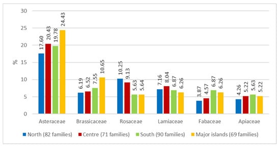 Asteraceae and Brassicaceae appear to be more widely used in the islands (24.43% and 10.65% respectively), Rosaceae are dominant in the North and the Centre (10.25% and 9.13% respectively), while the use of Fabaceae is slightly lower in the North and the Centre (3.87% and 4.57% respectively). Apiaceae show a prevalence in the southern sector (5.63%). The gradual increase in the use of Asteraceae in the island area was already recorded earlier in other ethnobotanic contributions [,].