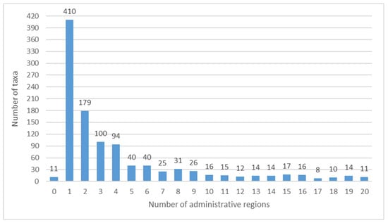 As many as 234 taxa (21.21%) are recorded only once, and 410 taxa (37.17%) are mentioned only for one region (Figure 5). In the figure the value of 0 is due to the absence for 11 taxa (1.00%), of any specific regional reference, so the information refers to Italy in general. These 11 entities (Ambrosia artemisiifolia, Argentina anserina subsp. anserina (=Potentilla anserina), Apios americana, Bassia scoparia, Butomus umbellatus, Chaerophyllum bulbosum subsp. bulbosum, Cynomorium coccineum subsp. coccineum (=Cynomorium coccineum), Nelumbo nucifera, Nuphar lutea, Sagittaria sagittifolia, Triglochin maritimum) all come from [] (apart from Apios americana, also cited by [], and Sagittaria sagittifolia, also cited by []) and it is strange that these citations have never been found in any Italian region.