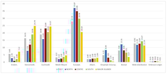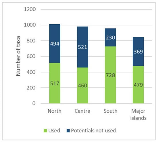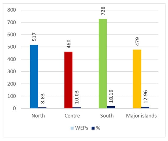 Among the four geographical areas considered, the one with the most taxa mentioned (728) is the South, followed by the North (517), Major islands (479), and Centre (460), even though—compared to regional flora—the WEPs percentage is higher to the South then the Major island (Figure 7).
