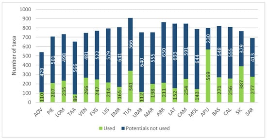 The analysis of results involved calculating the number of edible spontaneous taxa used for each Italian region. It is worth noting (Figure 6) that the region with the largest number of recorded taxa is Apulia (569), followed by Sicily (387) and Tuscany (341). On the other hand, the regions with the lowest use of WEPs are Trentino-Alto Adige, Aosta Valley, Umbria, and Molise with 86, 110, 112, and 143 taxa respectively.