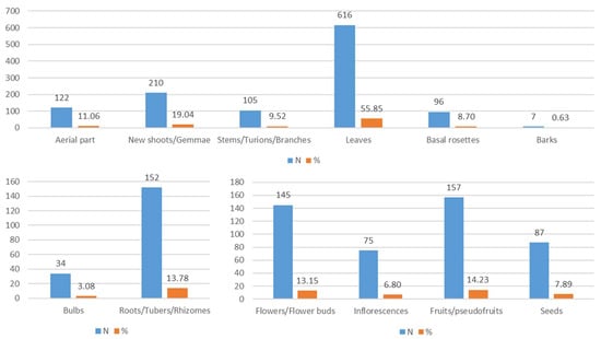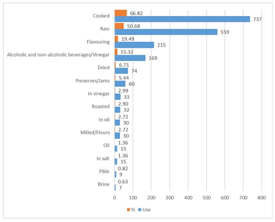Each taxon has been associated with the part used and with the methods through which it is consumed part of food preparations. These categories mainly refer to those listed by [], with some changes in terms of methods, which have become more articulated in order to provide more detailed information (Table 2).
