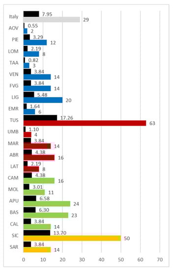For a comparison on a national scale, an estimate has been made of the reference flora for Italy using data from the checklist of spontaneous vascular flora in Italy [] and of alien flora in Italy []. More specifically, from the first list, the taxa present in Italy have been included, whereas extinct taxa have been deleted, as well as those no longer found and those reported by mistake, amounting to a total of 7582 taxa; the second list does not include casual taxa in all Italian regions, those which are extinct, no longer found and reported in error, amounting to a total of 844 taxa. On the contrary, the database still include alimurgic taxa whose presence in the region was considered uncertain, thus implicitly validating the identification completed. Starting from these 8426 taxa, moreover, a list has been compiled on the basis of species included in the database AlimurgITA, of alimurgic taxa potentially present in every Italian region, to be associated with species actually listed in the census both at regional and geographical sector level (North, Centre, South, Major islands) (Figure 1).