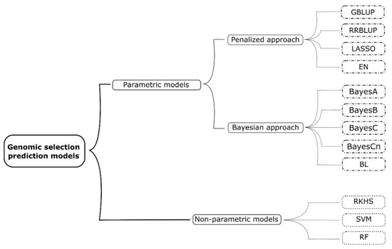 High-throughput genotyping generates a large amount of marker data, which are then used in GS. When the number of predictor variables (markers) is much greater than the number of observations (phenotypic values), the result is an infinite number of marker effect estimates. In order to reduce the problem of highly dimensioned data, different parametric and nonparametric models have been developed and used in GS (Figure 2).