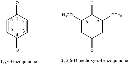 p-Benzoquinones or 1,4-benzoquinones are a subgroup of natural quinones, well known as metabolites produced by higher plants, fungi, bacteria and animals [19,20]. They are involved in important biological processes as bioenergetic transport, oxidative phosphorylation and electron transport, which confer potent antioxidant, anti-inflammatory and anticancer activities. Many studies report the mode of action of p-benzoquinones [21], and their biological activities prompted an investigation into their therapeutic application in medicine. Their therapeutic potential depends on the different substitution patterns that regulate a varied range of different cellular pathways and different selective activities [22]. Contrary to medical applications, their potential in agriculture has been poorly explored. Humic acids can be obtained by the alkaline transformation of p-benzoquinones for a potential application in agriculture [23]. p-Benzoquinone (BQ) and 2,6-dimethoxy-p-benzoquinone (DMBQ) are by-products in pretreated lignocellulosic biomass, which inhibit microorganism fermentation [24]. BQ has been used to evaluate the effects of race and age in cattle on the redox condition of their blood plasma [25].