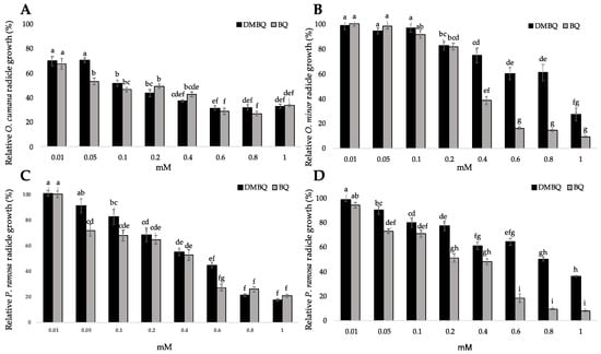 The effects of DMBQ and BQ on the growth of broomrape radicles. (A) O. cumana; (B) O. minor; (C) P. ramosa population 1; (D) P. ramosa population 2. For each broomrape species, treatments with different letters are significantly different according to the Tukey test (p = 0.05). Error bars represent the standard error of the mean.