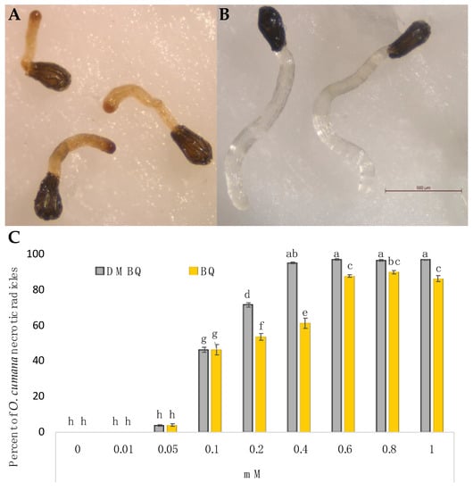 Necrosis developed by Orobanche cumana radicles treated with benzoquinones. (A) O. cumana radicles treated with DMBQ applied at 0.8 mM; (B) O. cumana control radicles; (C) Dosage response to DMBQ and BQ. Treatments with different letters are significantly different according to the Tukey test (p = 0.05).