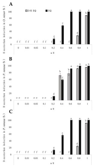 Haustorium-inducing effects DMBQ and BQ on broomrape radicles. (A) O. minor; (B) P.ramosa population 1; (C) P. ramosa population 2. Haustorium was not induced in O. cumana radicles by any of the compounds tested. For each broomrape species, treatments with different letters are significantly different according to the Tukey test (p = 0.05).