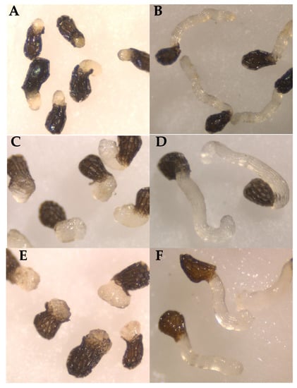 In vitro bioassays were carried out according to previous protocols [11,53,54]. The seeds of three broomrape species indicated above were surface sterilized by immersion in 0.5% (w/v) NaOCl and 0.02% (v/v) Tween 20, for 5 min, rinsed thoroughly with sterile distilled water, and dried in a laminar air flow cabinet. Broomrape germination is induced in the laboratory through a two-step process, a warm stratification called conditioning followed by a chemical induction by the synthetic strigolactone GR24 [55]. To achieve seed conditioning, approximately 100 seeds of each broomrape species were placed separately in 9 mm diameter glass fiber filter paper disks (GFFP; Whatman International Ltd., Maidstone, UK) moistened with 50 μL of sterile distilled water and placed inside Petri dishes in incubators at 23 °C in the dark for 10 days to allow seed conditioning. GFFP disks containing conditioned broomrape seeds were transferred onto a sterile sheet of filter paper to remove the excess of water, and then transferred to new 10 cm sterile Petri dishes. Fresh stocks of BQ and DMBQ were prepared right before the seed treatment in sterile distilled water to avoid toxic effects of organic solvents on broomrape radicles. Triplicate aliquots of 100 μL of BQ and DMBQ at 0.00 (control), 0.01, 0.05, 0.1, 0.2, 0.4, 0.6, 0.8, and 1 mM, individually mixed with the synthetic germination stimulant GR24 10−6 M, were applied to GFFP discs directly on top of the broomrape conditioned seeds. Petri dishes were sealed with parafilm and incubated in the dark at 23 °C for 7 days.