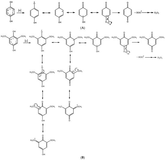Quinone/hydroquinone structures serve as cofactors in many metabolic pathways, playing critical roles in oxidation/reduction processes. Many p-benzoquinone derivatives have been identified in nature, such as vitamin K1 (phylloquinone) of vegetable origin, which intervenes in the blood coagulation processes; the yellow pigment contained in the leaves of the tropical bush known as henna (Lawsonia inermis) and the quinone complex known as coenzyme Q essential in oxidative phosphorylation. Many insects and arthropods use p-benzoquinones for defense [46]. The fundamental reaction that regulates this equilibrium is shown in Figure 6A. The presence of the substituents, their position and nature can differently affect the redox equilibrium of BQ, as reported in Figure 6B for DMBQ.