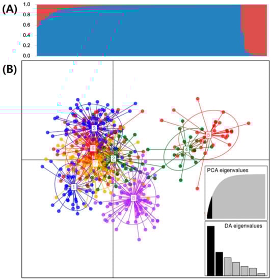 when 1/λ is Stoddart and taylor’s index and H is Shannon diversity, were calculated using poppr package for R software []. Analysis of molecular variance (AMOVA) and calculation of the coefficient of genetic differentiation among populations (PhiPT) and gene flow (Nm) was done using GenAlEx software (6.5 version) with 999 permutations []. The population structure was evaluated with a DAPC using the adegenet package for R software [,] according to Lee et al. []. Bayesian-based clustering was performed using STRUCTURE v.2.3.4 [], testing 3 independent runs with K from 1 to 11. Each run had a burn-in period of 50,000 iterations and 500,000 Monte Carlo Markov iterations, assuming an admixture model. The output was subsequently visualized with STRUCTURE HARVESTER v.0.9.94 []. The most likely number of clusters was inferred according to Evanno []. A membership coefficient q > 0.8 was used to assign samples to clusters. Samples within a cluster with a membership coefficient ≤0.8 were considered ‘genetically admixed’.