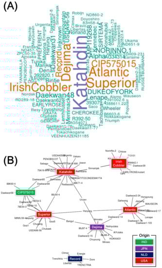(A) Word cloud of 248 potato cultivars or breeding lines with their pedigree information. (B) Network of high frequency seven potato cultivars from results of the word cloud. IND, India; JPN, Japan; NLD, Netherlands; USA, the United States of America.