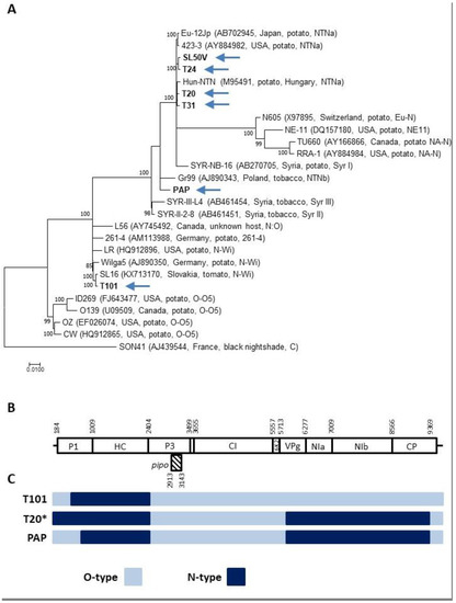 - Glais, L.; Bellstedt, D.U.; Lacomme, C. Diversity, Characterisation and Classification of PVY. In Potato virus Y: Biodiversity, Pathogenicity, Epidemiology and Management; Lacomme, C., Glais, L., Bellstedt, D., Dupuis, B., Karasev, A., Jacquot, E., Eds.; Springer: Cham, Switzerland, 2017. [Google Scholar] [CrossRef]