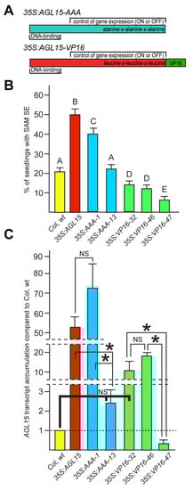 Shoot apical meristem somatic embryo (SAM SE) and transcript accumulation from different AGL15 transgenes. (A) Forms of the 35:AGL15 transgene predicted to remove AGAMOUS-like 15 (AGL15)’s repressive activity are shown. In the 35S:AGL15-AAA (35S:AAA), the codons for the leucine in the ethylene-responsive element binding factor-associated amphiphilic repression (EAR) motif are altered to encode alanines. In the 35S:AGL15-VP16 (35S:VP16) transgene, sequences encoding a strong transcriptional activation domain, VP16, are fused at the carboxyl-terminal end of AGL15. (B) SAM SE production by the different AGL15 transgenes compared to Col wild type (wt). Means and standard error of the mean for at least four biological replicates of the experiment are shown. Different letters indicate significant difference in SAM SE production between the different genotypes at p < 0.05 using a Student’s t-test. (C) AGL15 transcript accumulation in the different transgenic lines compared to Col wt (set to 1) in 10–12 d SAM SE tissue. Data shown are the means of at least two biological replicates of the experiment. * indicates a significant difference at p < 0.05. Only nonsignificant (NS) changes are noted for the transgenic lines compared to Col wt. Please note the breaks in the y-axis.