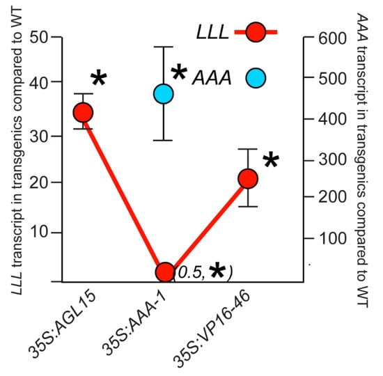 Because AGL15 has been shown to directly repress its own expression [15], it is possible that the 35S:AGL15-AAA transgene no longer represses the endogenous AGL15 gene, leading to up-regulation of the wild type form of AGL15 (also referred to as LLL to reflect the intact EAR domain). We used primers that were specific to the AAA and the LLL forms and found that the AAA form did not lead to overaccumulation of AGL15 transcript from the endogenous gene, but rather significantly decreased transcript accumulation compared to wild type (Figure 2). Thus, the LLL motif is not necessary for AGL15 repression of its own expression.