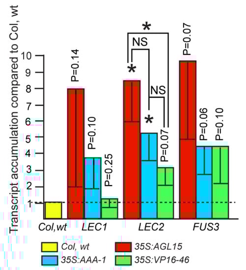 Transcript accumulation from genes encoding key embryo transcription factors in response to the different forms of AGL15. The results shown are the means and standard error of the mean for at least five biological replicates. * indicates significance compared to Col wt or the indicated comparison at p < 0.05 as assessed with a Student’s t-test. NS, not significant. Differences in transcript accumulation for LEC1 and FUS3 between the different transgenic backgrounds were NS for all biological replicates considered as a whole.