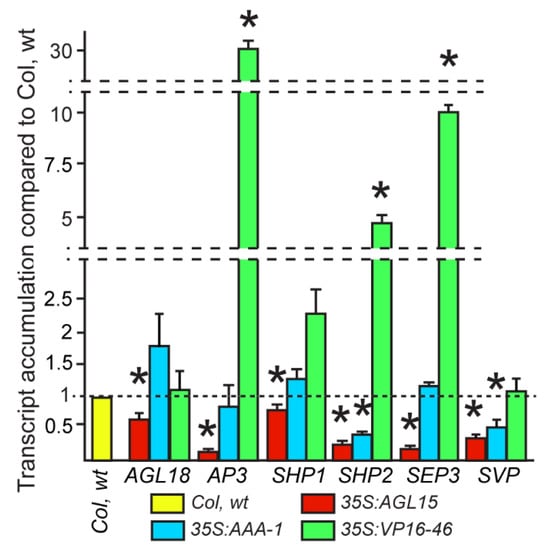 Because LEC2 and FUS3, transcript accumulation is not decreased in 35S:AGL15-VP16 compared to Col wt, but SAM SE is significantly decreased, there appears to be additional factors at play other than regulation of LAFL genes. MADS-domain proteins form higher order complexes with other MADS proteins to drive gene expression and particular complexes may be responsible for different developmental programs (reviewed in [22]). AGL18 is the closest related paralog to AGL15 in Arabidopsis and has redundant functions in promotion of SE and in control of flowering time with AGL15 [5,23,24,25]. AGL15 and AGL18 have also been reported to interact via protein–protein interactions [26]. Therefore, we assessed AGL18 transcript accumulation in response to the different forms of AGL15. Agreeing with a microarray experiment [8] and a preliminary RNA-seq investigation (Joshi and Perry, unpublished), 35S:AGL15 represses transcript accumulation from AGL18 as confirmed by qRT-PCR compared to Col wt (Figure 4). There is a slight but non-significant increase in this transcript in 35S:AGL15-AAA1, and no change in 35S:AGL15-VP16-46. As such, we do not believe increased AGL18 expression in 35S:AGL15-AAA is responsible for the ability of this transgene to promote SAM SE.