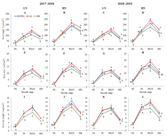 In the 2017~2018 growing season, likewise, the mean RAs of A-NILs vs. B-NILs at SS, JS, PA10 and MS were 1.7 vs. 1.2, 9.1 vs. 7.3, 13.6 vs. 10.1 and 7.6 vs. 5.8 cm2/cm2 under the LN environment (Table 1, Figure 1E), and 2.3 vs. 2.0, 11.8 vs. 10.7, 18.3 vs. 14.0 and 12.3 vs. 10.0 cm2/cm2 under the HN environment (Table 1, Figure 1F), respectively; indicating that the mean RAs of the A-NILs increased by 41.7%, 24.7%, 34.7% and 31.0% under the LN environment, and 15%, 10.3%, 30.7% and 23% under the HN environment higher than those of the B-NILs at the comparable stages (p < 0.05). In the 2018~2019 growing season, the unvarying trends in RA difference between the two types of NILs were observed at the comparable growth stages under the corresponding nitrogen environments, except the RAs at SS stage under the HN environment (Table 1; Figure 1G,H).