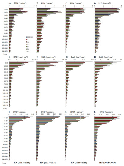 Roots were sampled at seedling stage before winter (SS), jointing stage (JS), 10 days post anthesis (PA10) and maturity (MS) under both LN and HN environments during the 2017~2018 and 2018~2019 growing seasons. After removing the above-ground part of the plants, the corer of 10 cm diameter was used to take the soil cores from the rows in each plot. The depth of sampling was 60, 100, 150 and 160 cm at the SS, JS, PA10 and MS at intervals of 10 cm, respectively. The soil cores were taken to the laboratory and the root samples were obtained as described by Zhang et al. [18]. The root samples were stored at –20 °C to prevent decay. On quantifying the root length (RL, cm) and root surface area (RA, cm2), the root samples were tiled in a transparent dish to be scanned using ScanMaker i800 Plus Scanner (600 DPI) and analyzed by LA-S software (Hangzhou Wanshen Detection Technology Co., Ltd., Hangzhou, China, www.wseen.com). After being scanned, the roots were collected, oven-dried at 105 °C for an hour and then kept at 80 °C until constant weight to determine root dry weight (RDW, mg). The root length density (RLD, cm/cm3), root area density (RAD, cm2/cm3) and root weight density (RWD, mg/cm3) were calculated using RL, RA and RDW divided by the soil core volume.