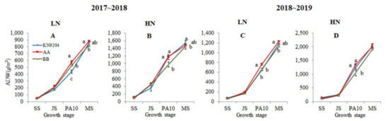 Aerial dry weight (ADW) of KN9204 and the QMrl-7B near isogenic lines (NILs) at different stages. 2017~2018 (A,B) and 2018~2019 (C,D) indicate growing seasons; LN (A,C) and HN (B,D) indicate low nitrogen and high nitrogen environments, respectively; AA indicates QMrl-7B NILs with the superior alleles; BB indicates QMrl-7B NILs with the inferior alleles; SS, JS, PA10 and MS indicate seedling stage, jointing stage, 10 days post anthesis and maturity, respectively; Different lowercases indicate significant differences (p < 0.05) among the genotypes at the same growth stage.