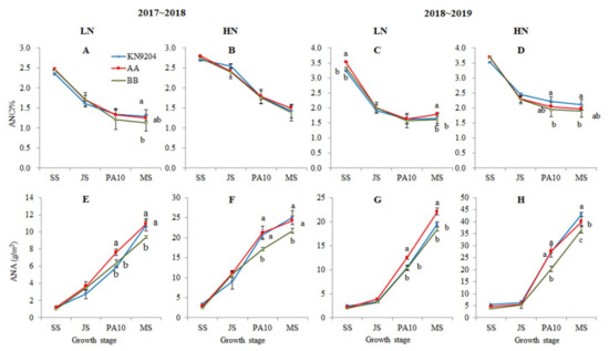 The ANA tended to increase with the advancement of the growth period (Table S1, Figure 4E–H), but no significant differences were found between the two types of NILs at SS and JS. At PA10 and MS, on the other hand, the A-NILs exhibited significant higher ANA than the B-NILs under both LN and HN environments (p < 0.05). At PA10 stage, the mean ANAs of the A-NILs vs. B-NILs were 7.62 vs. 6.35 and 12.51 vs. 10.37 g/m2 under the LN environment, and 21.19 vs. 17.12 g/m2 and 27.69 vs. 20.36 g/m2 under the HN environment in the two growing seasons, respectively, indicating that the A-NILs were heavier than the B-NILs in ANA by 20.0%, 20.6%, 23.8% and 36.0% under the corresponding environments, respectively. At MS stage, the A-NILs also accumulated more N than the B-NILs, the mean ANAs of the A-NILs vs. B-NILs were 10.99 vs. 9.42 g/cm2 and 22.12 vs. 18.43 g/m2 under the LN environment, and 24.34 vs. 21.71 g/m2 and 40.05 vs. 36.71 g/m2 under the HN environment in the two growing seasons, respectively, indicating that ANAs of the A-NILs were higher than those of the B-NILs by 16.7% and 20.0% under the LN environment as well as 12.1% and 9.1% under the HN environment.