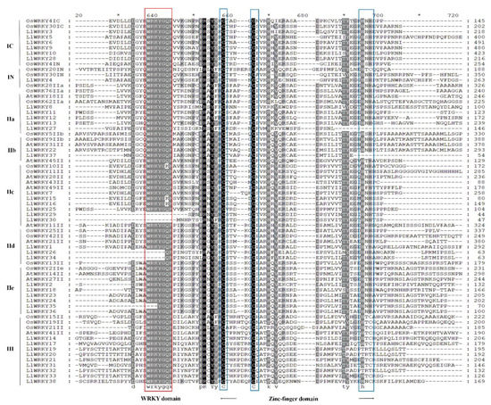 Multiple sequence alignment of various types of WRKY domains (I, II, and III) from Lillium (LlWRKY), Arabidopsis (AtWRKY), and rice (OsWRKY). Identity, similarity, and deletions among WRKY alignments are indicated by black and grey shades and hyphens, respectively. A red box represents the WRKY domain and a blue box the zinc finger domain. N means N-terminal and C means C-terminal.