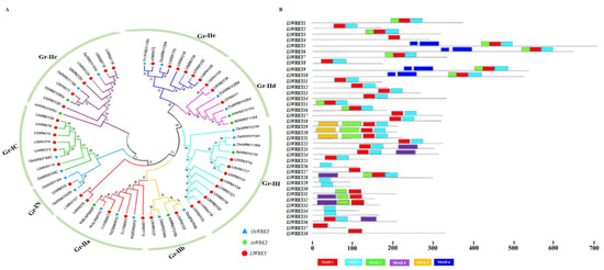 Unrooted phylogenetic tree analysis of WRKY proteins: (A) Lilium (38), rice (19), and Arabidopsis (7); (B) conserved motifs of 38 LlWRKY proteins. The phylogenetic tree was constructed using MEGA7. Different colors represent different groups and red circles represent LlWRKY, blue triangles represent OsWRKY and green squares represent AtWRKY proteins. MEME was used to predict motifs, and boxes represent these motifs.