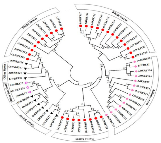 Functional grouping of the annotated LlWRKY proteins based on the homologous gene information regarding biotic stress-responsive genes. The unrooted phylogenetic tree was constructed for Lilium longiflorum and rice proteins to identify homologous gene pairs. Red circles represent the responsive genes to biotic stress; pink squares, black triangles, and magenta squares represent genes responsive to abiotic stress-responsive, other stresses, or possessing other functions, respectively.