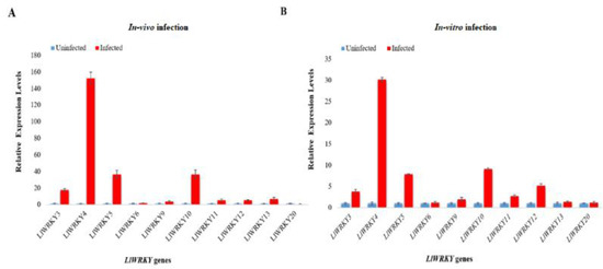 Nine genes, LlWRKY3, -5, -6, -9, -10, -11, -12, -13, and -20, are associated with biotic stresses and one, LlWRKY4, related to another function were selected to determine the expression profiles in vivo (in field) and in vitro (laboratory) after B. elliptica infection. As shown in Figure 4A,B, the selected LlWRKY genes were induced to biotic stresses. All LlWRKY genes showed higher expression than uninfected L. longiflorum. In particular, LlWRKY3, -4, -5, -10, and -12 had high expression levels in response to B. elliptica infection under both conditions—in vivo and in vitro. LlWRKY4 showed a significantly high expression after B. elliptica infection in vivo and in vitro (Figure 4A,B). In in vivo analysis, the expression levels of five LlWRKY genes in infected leaf highly increased in comparison to un-infected leaf. The gene LlWRK4 shows the highest expression—an increase by 152.287-fold. Similarly, LlWRKY10, -5, and -3 showed a 36.286-, 36.062-, and 17.296-fold increase, respectively. In in vitro analysis, LlWRKY4 gene shows the highest expression, 30.1789-fold. Other genes showed expression in the following order: LlWRKY10 > LlWRKY5 > LlWRKY12 > LlWRKY3. In in vivo and in vitro condition both, LlWRKY6, -9, -11, -13, and -20 showed slight expression. Most of the LlWRKY genes from L. longiflorum have more expression in the in vivo condition than expression in the in vitro condition because of the natural environments. Plants in their natural habitat are constantly subjected to multiple fluctuating environmental factors, and complex genetic regulatory networks are functioning in them.
