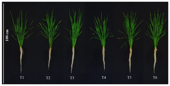 Growth of shoots and roots of rice plants treated with Si and polyethylene glycol (PEG). T1: Control; T2: 1 mM SiO2; T3: 2 mM SiO2; T4: 10% PEG 8000; T5: 10% PEG 8000 + 1 mM SiO2; T6: 10% PEG 8000 + 2 mM SiO2.