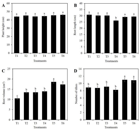 Plant height (A), root length (B), root volume (C) and number of tillers (D) of rice plants treated with Si and PEG. T1: Control; T2: 1 mM SiO2; T3: 2 mM SiO2; T4: 10% PEG 8000; T5: 10% PEG 8000 + 1 mM SiO2; T6: 10% PEG 8000 + 2 mM SiO2. The figure represents the mean of four independent replicates. Means ± SD with different letters in each variable indicate statistical differences between treatments (Duncan, p ≤ 0.05).